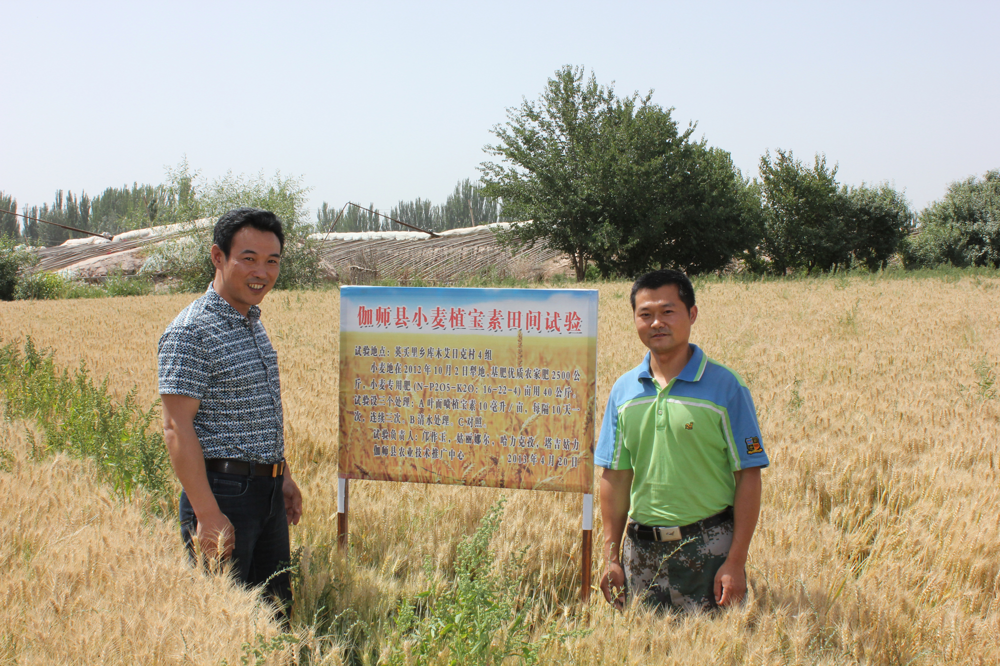 2013年4月在新疆省伽師縣英買里鄉(xiāng)庫木艾日克村4組的試驗田,試驗田負責人鄺作玉對來到小麥田間考察的郭勇軍說:“在小麥抽穗-灌漿期,每隔10天噴施一次植寶素,能明天改善小麥品質,提高小麥抗逆性,增加小麥穗粒數和千粒重,較對照增產10.1%,增收128元/畝。效果太明顯了。”